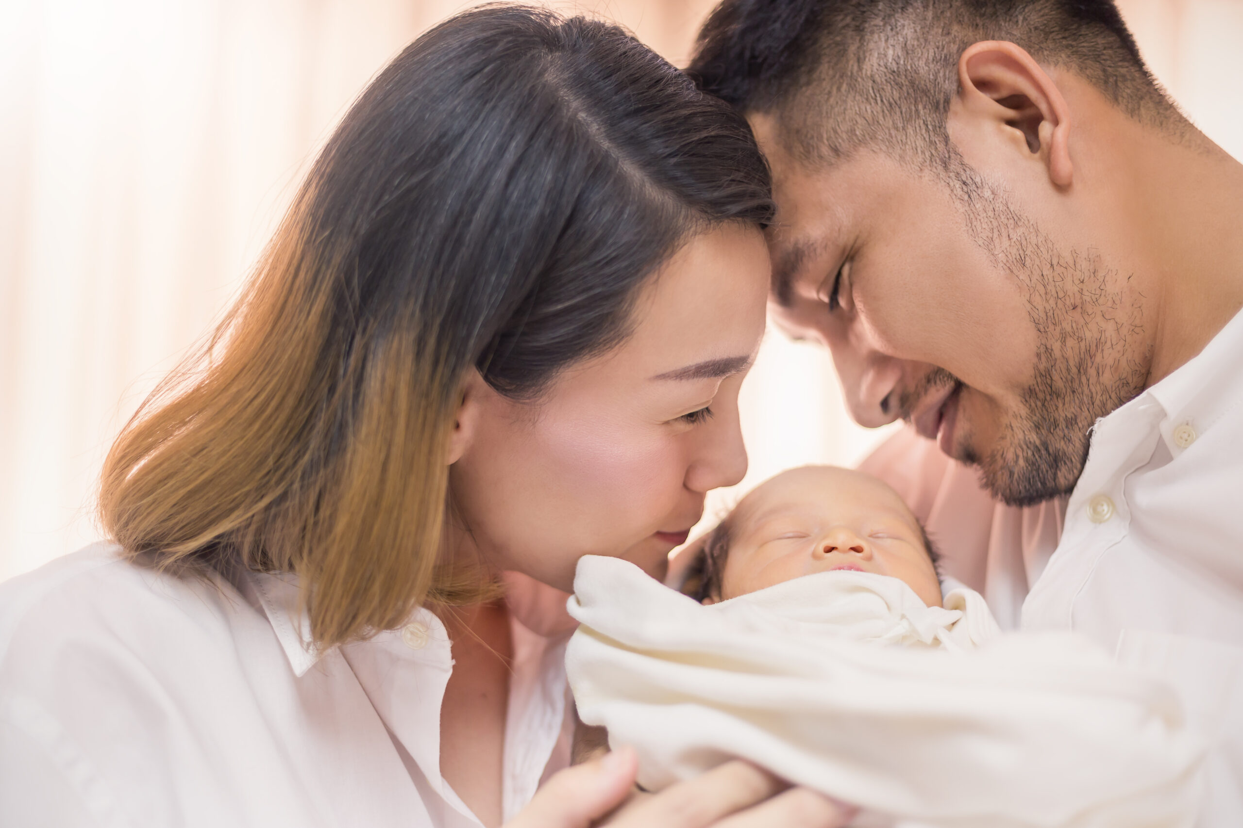 Asian parents newborn baby, Close up portrait of asian young couple father mother holding kissing their new born baby in hospital bed. Happy family love newborn nursery mother’s day holiday concept